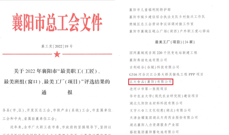 為廣泛開展美好環(huán)境與幸福生活共同締造活動,評選為襄陽市經(jīng)濟社會高質(zhì)量發(fā)展做出積極貢獻的單位和群體及個人,襄陽市總工會開展了尋找襄陽市“最美職工(工匠)、最美工廠(項目)、最美班組(窗口)”的活動。歷時2個月的多輪評定,襄陽市總工會決定授予正大食品(襄陽)有限公司——襄陽市“最美工廠(項目)”獎項。